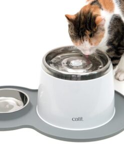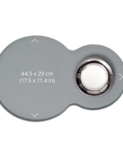 Alfombrilla protectora con plato Catit es excelente en combinación con las fuentes bebederas Catit, los comederos múltiples Catit y los platos de alimentación Catit. Este producto es una suave alfombrilla de silicona con borde y un plato de acero inoxidable higiénico. El plato tiene un diseño poco profundo para evitar que tu gato tenga molestias con sus bigotes.
