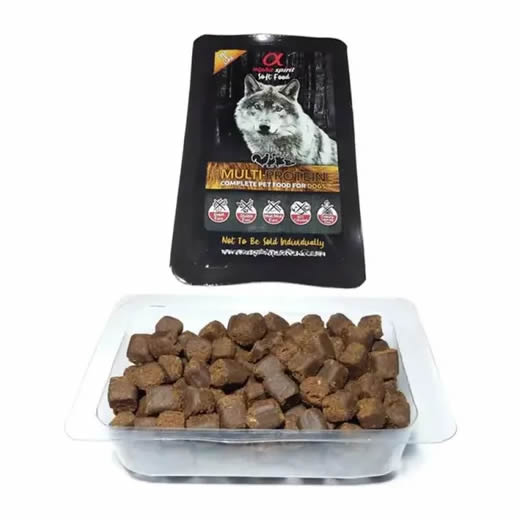 Alpha Spirit Semi-Húmedo Multiprotein es un alimento completo para perros elaborado con ingredientes naturales y carne fresca, diseñado para ofrecer una nutrición más natural y altamente palatable. Su receta sin granos, sin gluten y sin harinas cárnicas lo convierte en una excelente opción para perros con digestión sensible.
