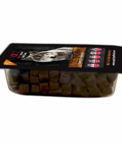 Para producir 1 kg de este alimento, se utilizan aproximadamente 2,15 kg de carne fresca y 0,25 kg de pescado fresco, garantizando una dieta rica en proteínas de alta calidad que contribuyen a la energía, salud y brillo del pelaje de tu perro.