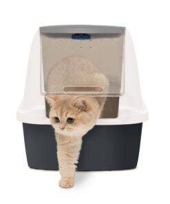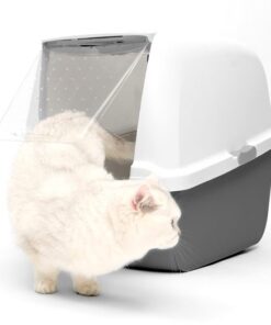 - El diseño posterior elevado de la caja de arena evita que las fugas de orina y la puerta superior se abre completamente, lo que permite un fácil acceso a cada lugar, desde la parte frontal hasta la parte posterior. El mecanismo especial de apertura de la puerta frontal permite que se levante hacia afuera y hacia arriba con facilidad, evitando que las patas o colas se enganchen. Los colores neutros en dos tonos de la caja de arena asegura que se adapte a cualquier decoración de la habitación.