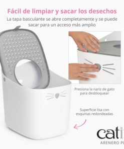 - Control de Olores y Arena: La entrada superior y la tapa texturizada evitan que la arena se esparza por el suelo, manteniendo tu casa impecable.