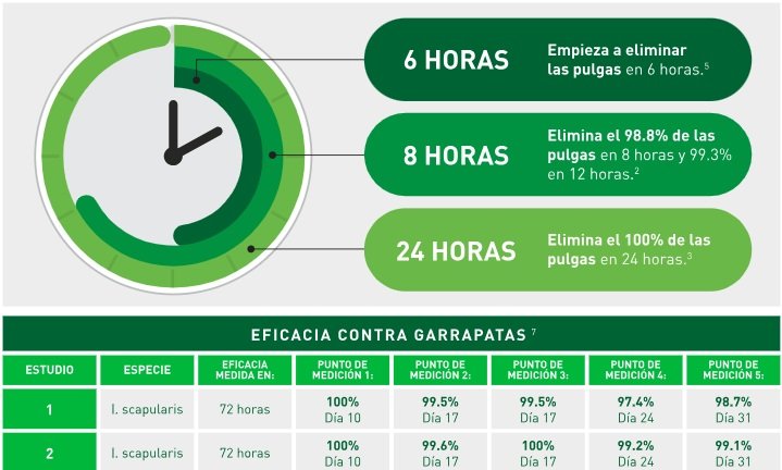 En el caso de pulgas, las pulgas existentes en el animal mueren en el término de 8 horas después de la administración del producto. Durante todo un mes, en el caso de nuevas infestaciones, las pulgas son eliminadas en el término de 12 horas.