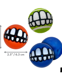 Las tallas S y M incluyendo una pelota chirriante, una pelota de tenis y una pelota de golosinas que puedes rellenar con tus golosinas favoritas, ¡todas ellas tienen los clásicos dientes Grinz para un entretenimiento total!