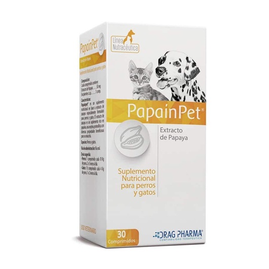 Papainpet es un suplemento nutricional para perros y gatos a base de extracto de papaya, rico en papaína, una enzima proteolítica con propiedades antiinflamatorias y antiedematosas. Es un apoyo útil cuando tu veterinario quiere ayudar a reducir molestias asociadas a golpes, hematomas, contusiones e inflamaciones locales.